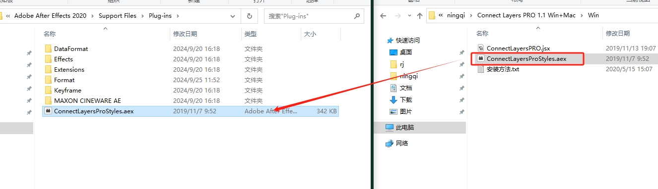 1.复制ConnectLayersProStyles.aex插件文件到AE的插件目录,如: