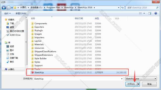 3、弹出窗口选择SketchUp.exe,LayOut.exe,Style Builder.exe(软件安装目录内可找到)相应程序打开即可