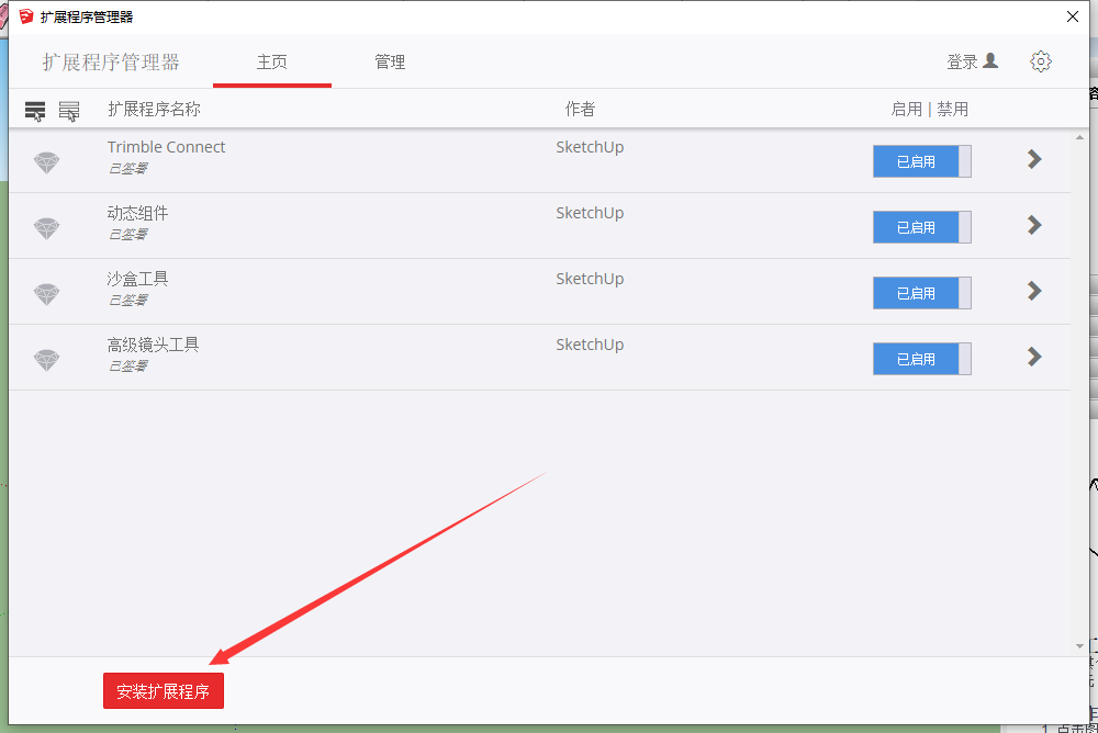 打开草图大师,点击【窗口】-【扩展程序管理器】